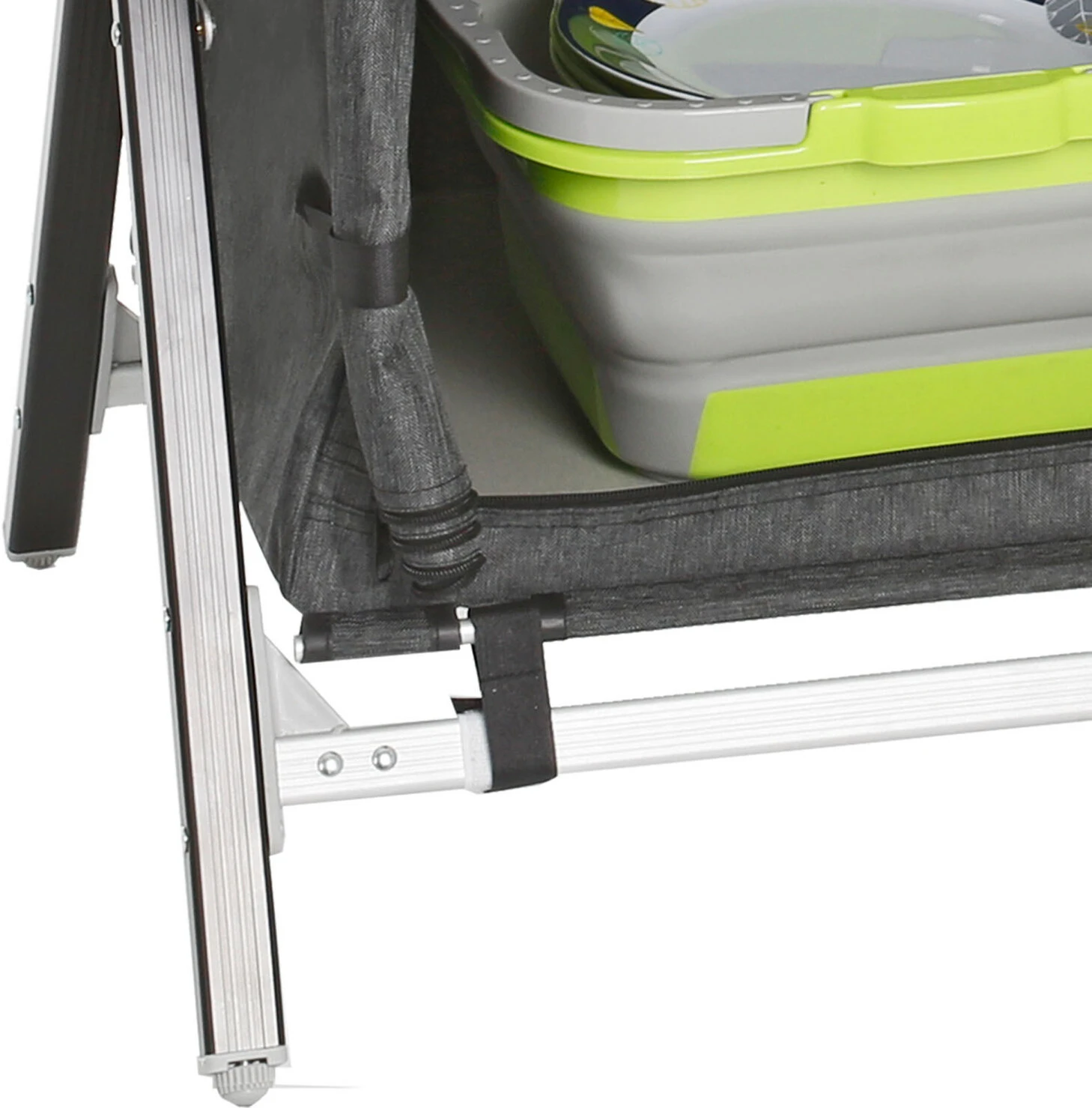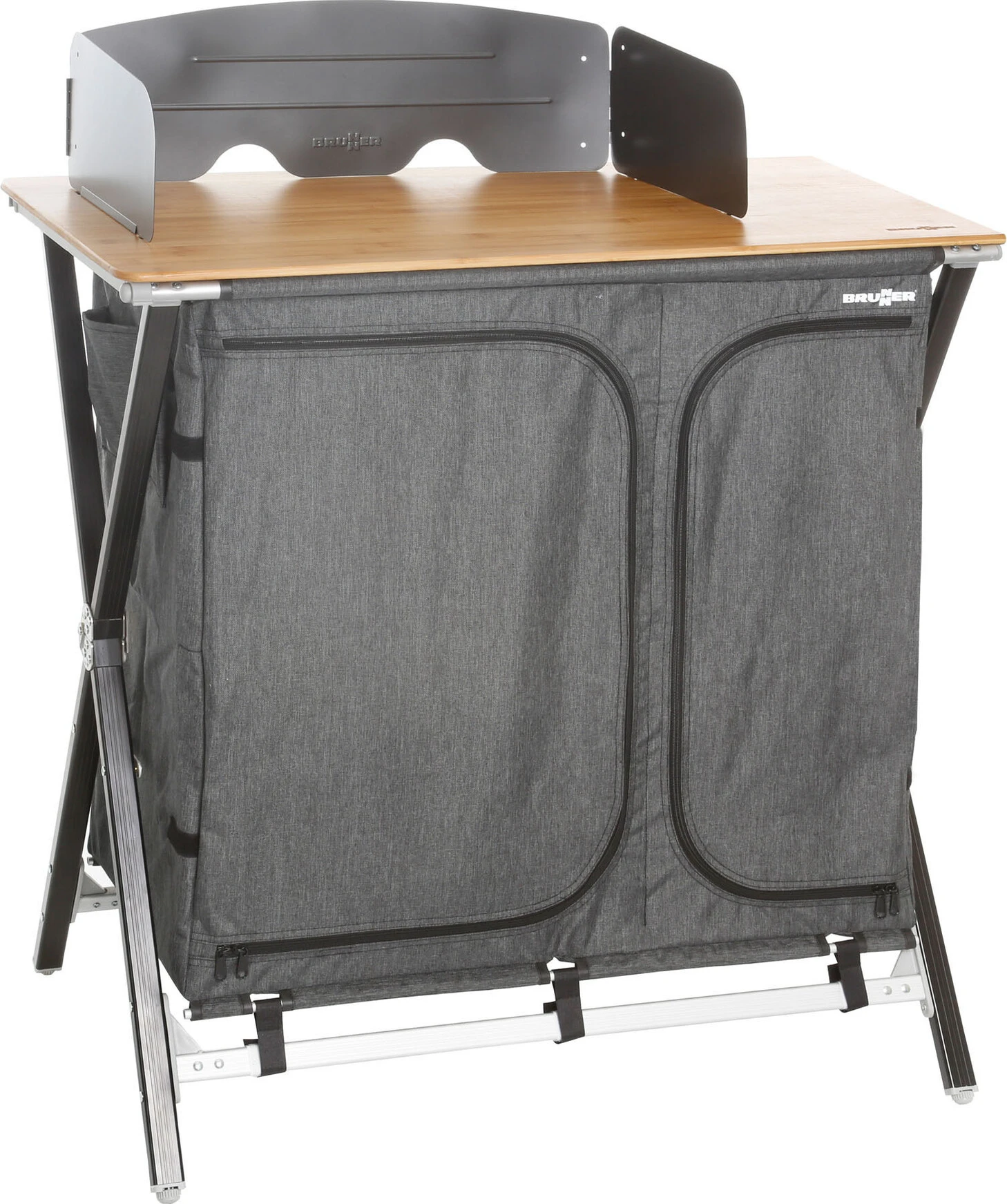Praktische keukenbox met CROSS frame van aluminium rechthoekig profiel en centrale metalen verbinding. Alle poten zijn in hoogte verstelbaar. Met 2 legplanken binnenin en een werkblad bovenin van bamboe. Montageloos systeem. Incl. windscherm en draagtas.