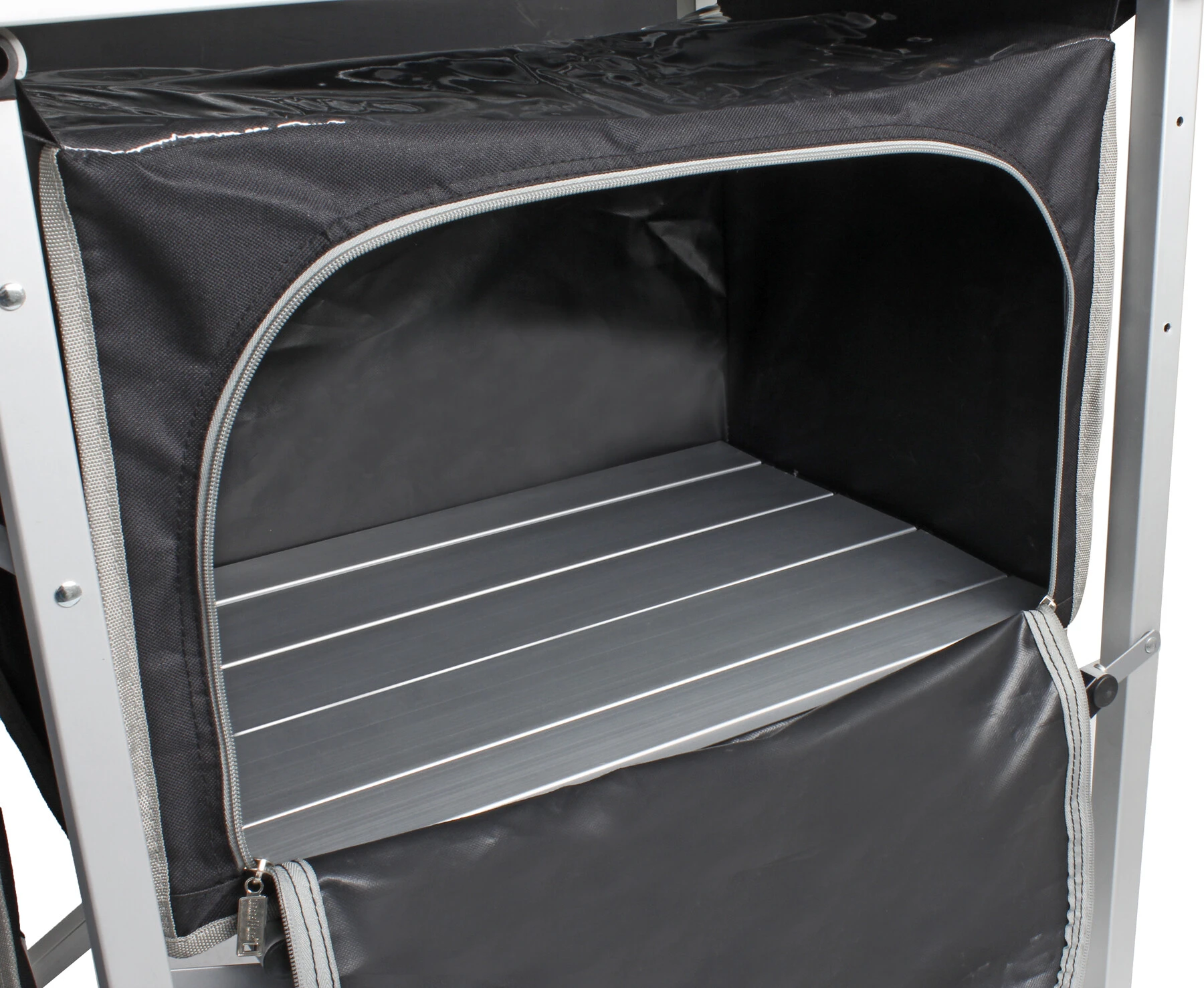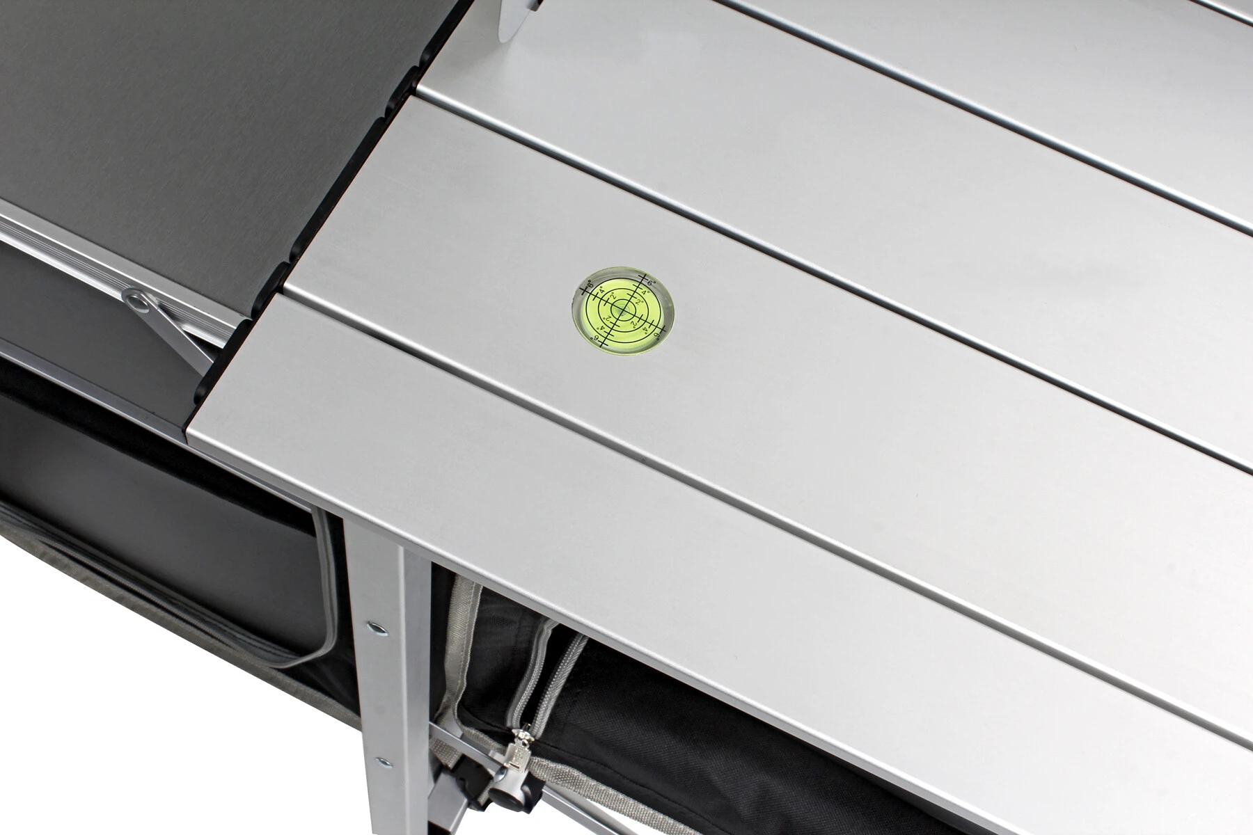 Nieuw ontworpen kampeerkeuken met extra stabiele vouwstructuur van vierkant aluminium profiel. Alle poten zijn in hoogte verstelbaar en voorzien van zinkvaste platen. 2 separate kasten bieden voldoende opbergruimte voor voedsel en kookgerei. De levering omvat een winden spatbescherming en een praktische draagtas.