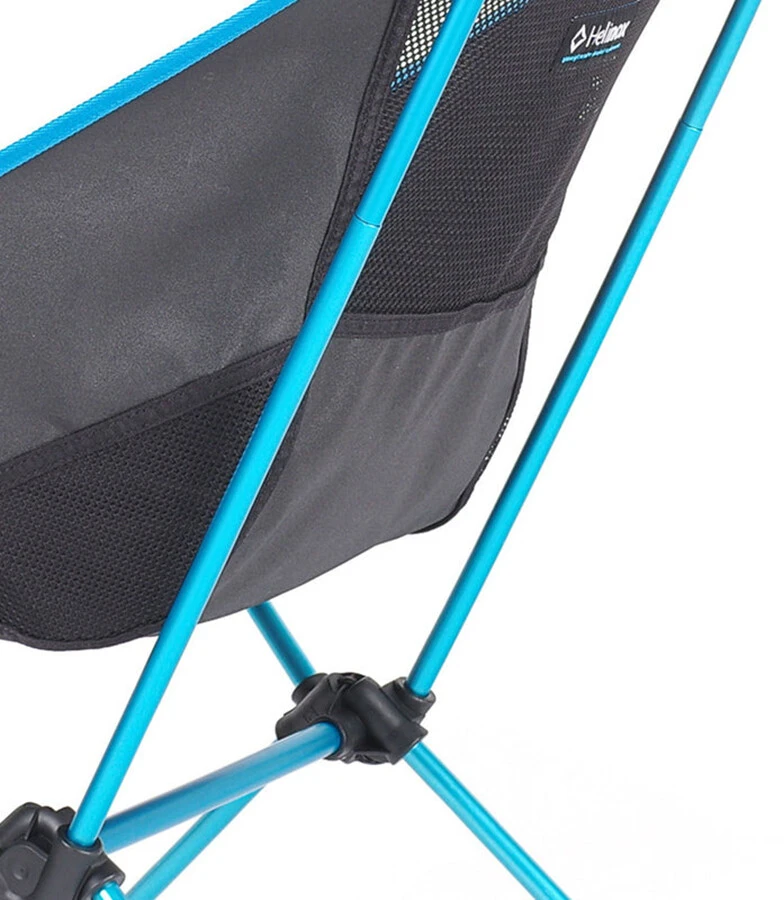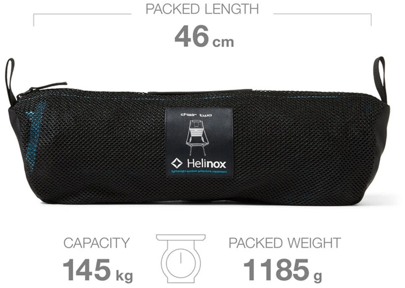 De Helinox Chair Two is een extra lichte, opvouwbare campingstoel met een hoge rugleuning voor extra comfort de hele dag door. Hij heeft een hoge rugleuning voor extra steun, een verstelbare hoofdsteun en zijvakken voor smartphone, snacks en zonnebril. Hij weegt ongeveer evenveel als een fles wijn en is kleiner verpakt dan een brood. Robuust en licht – het hart van het innovatieve ontwerp is een frame van een speciale DAC-aluminiumlegering met een superieure stabiliteit in verhouding tot het gewicht en een draagvermogen tot 145 kg.